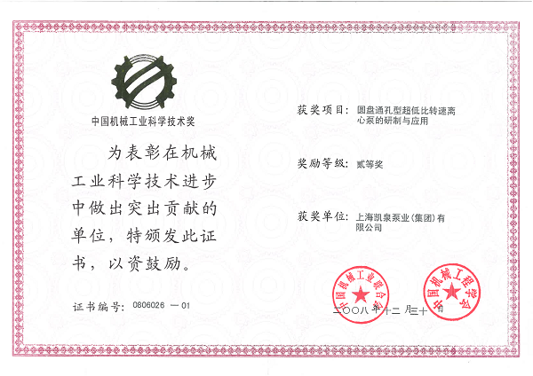 集團圓盤通孔型超低比轉速離心泵的研制與應用榮獲“中國機械工業科學技術二等獎”