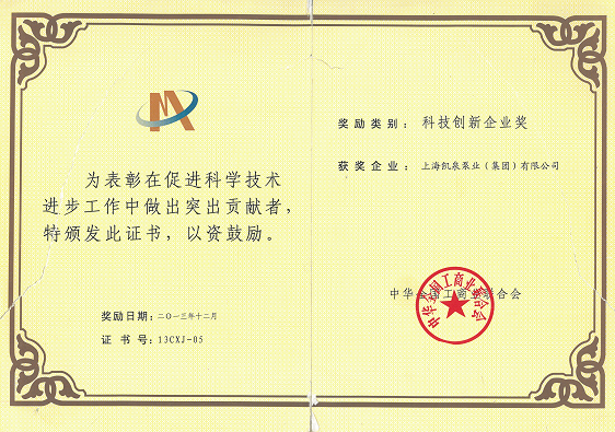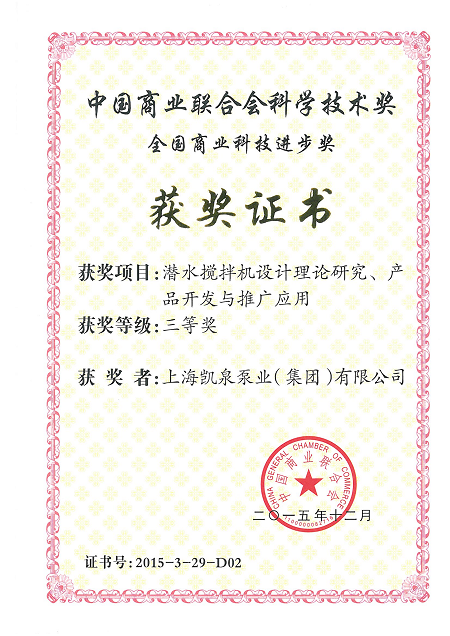 集團潛水攪拌機設計理論研究、產品開發與推廣應用榮獲“全國商業科技進步三等獎”