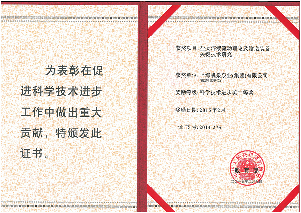 集團環保工程用高效輸送推流裝備關鍵技術研究與工程應用榮獲國家教育部頒發的“科學技術進步二等獎”