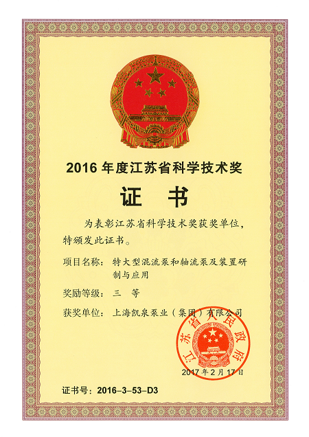 集團特大型混流泵和軸流泵及裝置研制與應用榮獲“江蘇省科學技術三等獎”