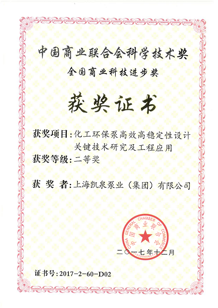 集團化工環保泵高效高穩定性設計關鍵技術研究及工程應用榮獲“全國商業科技進步二等獎”