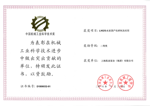 集團LNG 海水泵國產化研制及應用榮獲“中國機械工業科學技術二等獎”