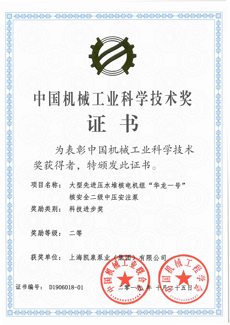 集團大型先進壓水堆核電機組“華龍一號”核安全二級中壓安注泵榮獲“中國機械工業科學技術獎二等獎”