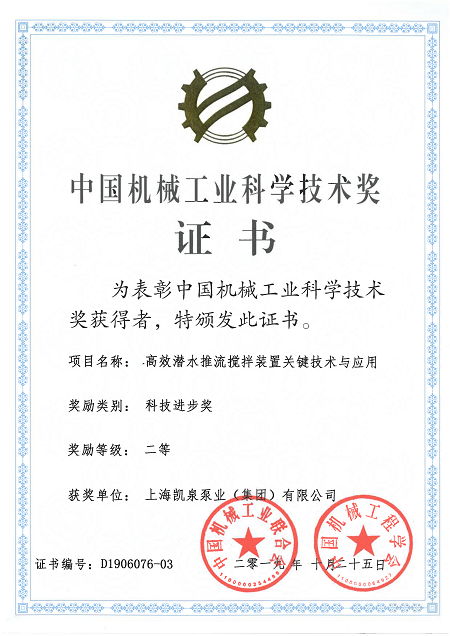 集團高效潛水推流攪拌裝置關鍵技術與應用榮獲“中國機械工業科學技術獎二等獎”