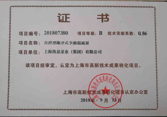 集團自控型敞開式節能混流泵被認定為“上海市高新技術成果轉化項目”